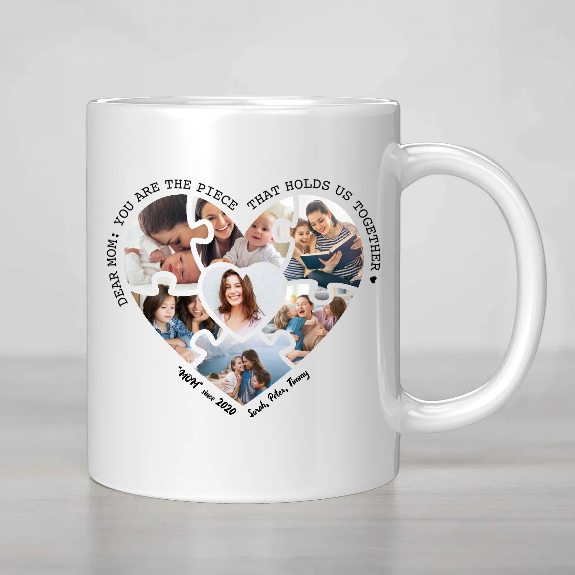 Add up to 7 photos to create a one-of-a-kind puzzle heart design, bringing together cherished memories that symbolize the unbreakable connection. Plus, include a short personalized message and the names of the children to make it even more special. This mug is more than just a gift—it’s a reminder of the love, strength, and support that holds everything together.